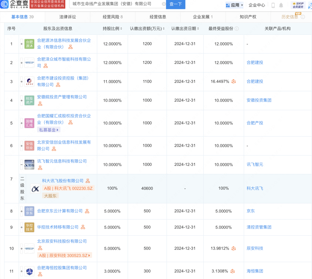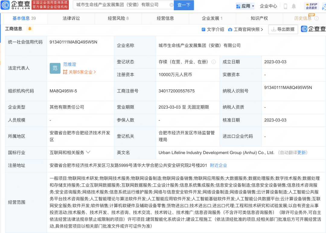 近日,城市生命线产业发展集团(安徽)有限公司成立,法定代表人为范维澄,注册资本1亿元人民币,经营范围包含:物联网技术研发;大数据服务;云计算设备销售;互联网安全服务等。股权穿透显示,该公司由科大讯飞全资子公司讯飞智元信息科技有限公司、辰安科技等共同持股。