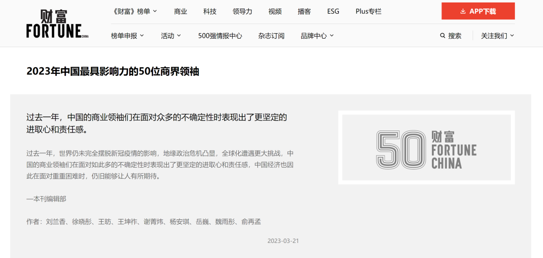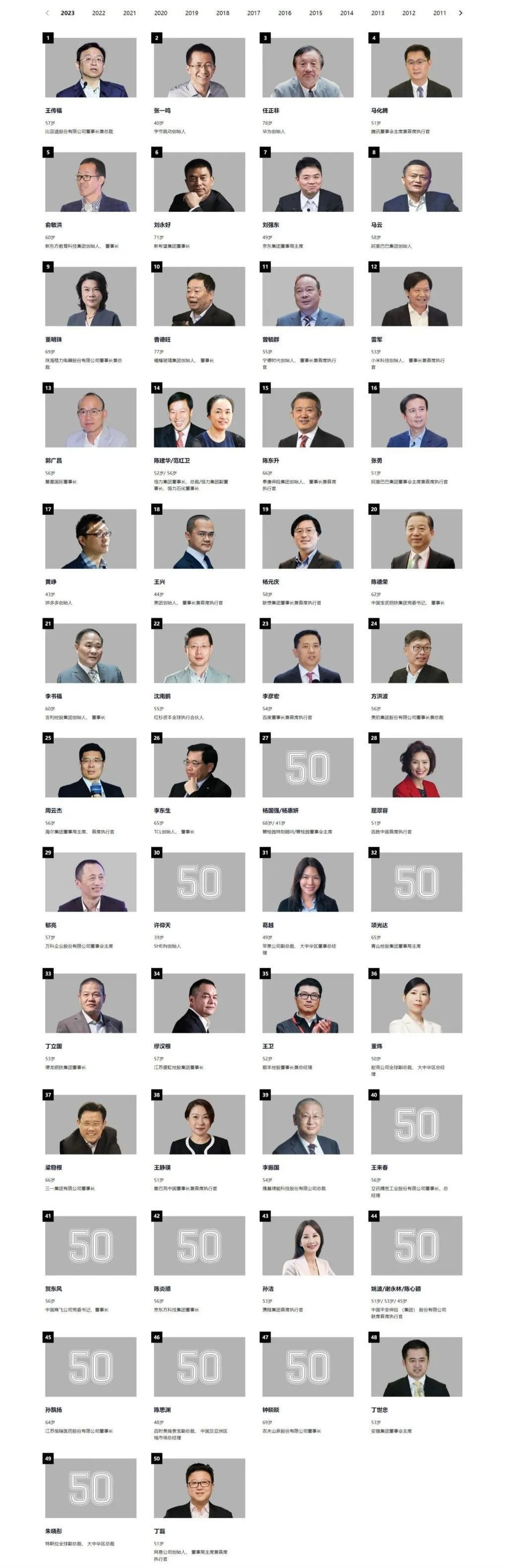 3月21日,财富中文网公布了2023年中国最具影响力的50位商界领袖。过去一年,世界仍未完全摆脱新冠疫情的影响,地缘政治危机凸显,全球化遭遇更大挑战。季节来来往往,商界起起伏伏。