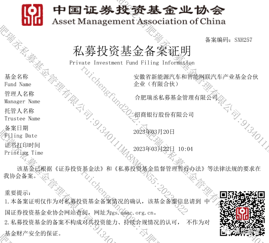 3月20日,安徽省新能源汽车和智能网联汽车产业基金顺利通过中国证券投资基金协会基金产品备案,备案编号为:sxh257,总规模40.4亿元。