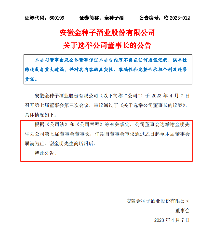 4月7日,金种子酒(600199.sh)发布公告称,公司于2023年4月7日召开第七届董事会第三次会议,审议通过了《关于选举公司董事长的议案》。根据《公司法》和《公司章程》等有关规定,公司董事会选举谢金明为公司第七届董事会董事长,任期自董事会审议通过之日起至本届董事会届满为止。