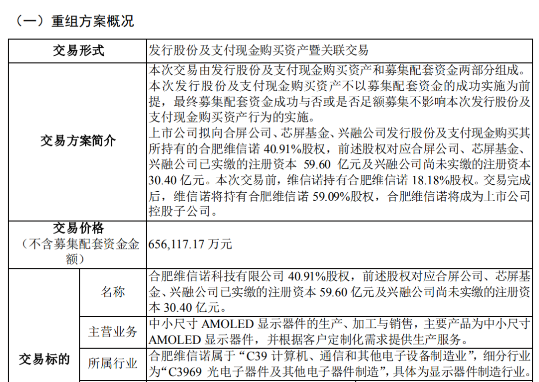 根据草案,维信诺拟向合屏公司、芯屏基金、兴融公司发行股份及支付现金购买其所持有的合肥维信诺40.91%股权。标的股份作价65.6亿元,其中以发行股份的方式支付对价44.6亿元,以支付现金的方式支付对价21亿元。同时,公司拟向不超过35名特定投资者非公开发行人民币普通股募集不超过22亿元的配套资金。