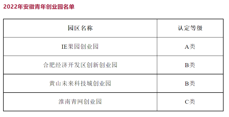 近日,安徽省人社厅发布《关于认定2022年安徽青年创业园的通知》,认定ie果园创业园等4家园区为2022年安徽青年创业园。