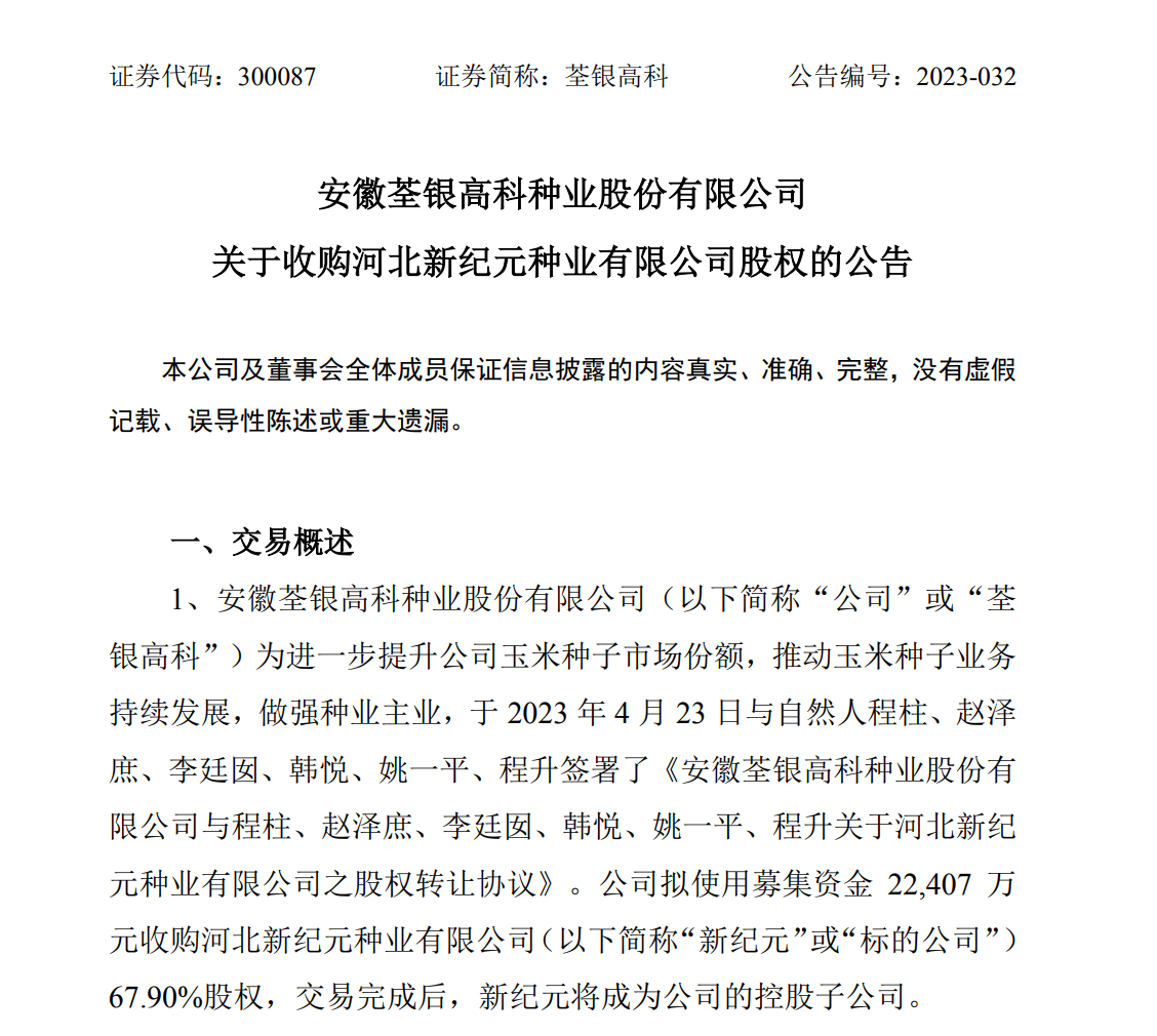 据悉,荃银高科于4月23日与自然人程柱、赵泽庶、李廷囡、韩悦、姚一平、程升签署了《安徽荃银高科种业股份有限公司与程柱、赵泽庶、李廷囡、韩悦、姚一平、程升关于河北新纪元种业有限公司之股权转让协议》。拟使用募集资金2.24亿元收购新纪元。