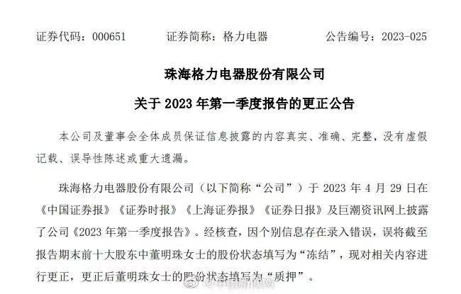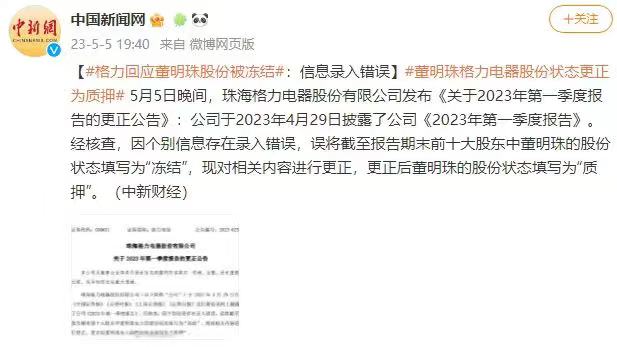 5月5日晚间,珠海格力电器股份有限公司发布《关于2023年第一季度报告的更正公告》:公司于2023年4月29日披露了公司《2023年第一季度报告》。经核查,因个别信息存在录入错误,误将截至报告期末前十大股东中董明珠的股份状态填写为“冻结”,现对相关内容进行更正,更正后董明珠的股份状态填写为“质押”。