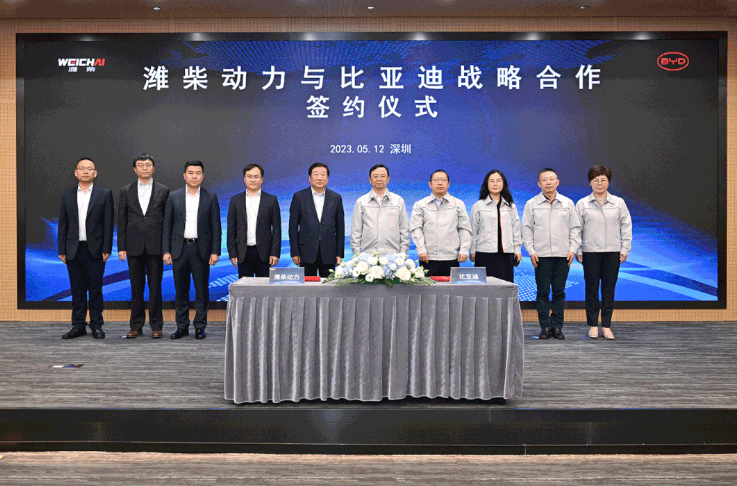 5月12日上午,潍柴动力与比亚迪在深圳签署战略合作协议,潍柴动力董事长、ceo谭旭光,比亚迪董事长兼总裁王传福出席活动并见签。潍柴动力执行总裁王德成、比亚迪集团副总裁何龙代表双方签署战略合作协议。