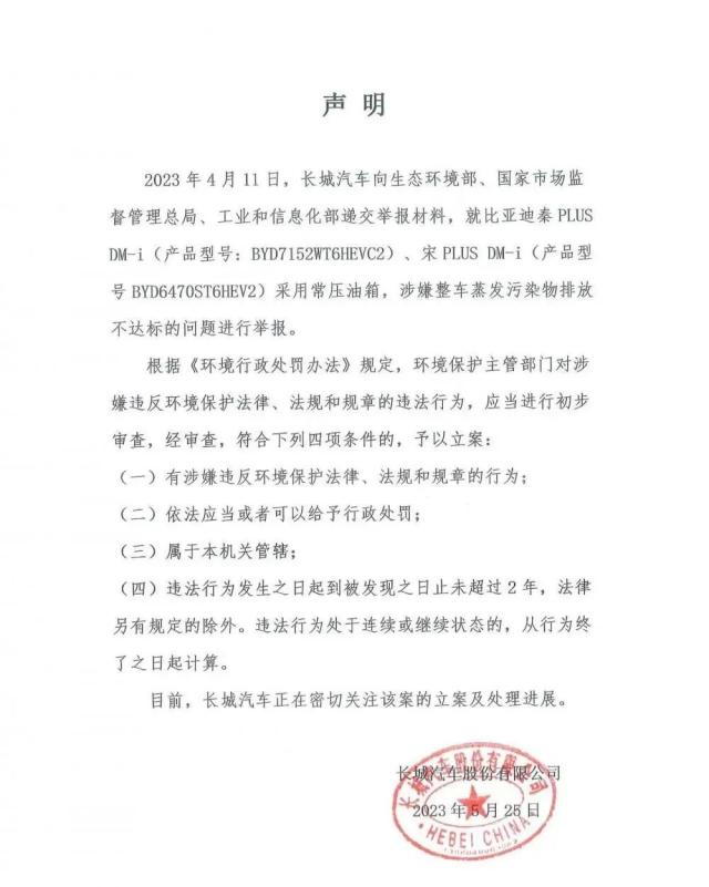 声明显示,长城汽车于今年4月11日向生态环境部、国家市场监督管理总局、工业和信息化部递交举报材料,就比亚迪秦plusdm-i(产品型号:byd7152wt6hevc2)、宋plus dm-i(产品型号byd6470st6hev2)采用常压油箱,涉嫌整车蒸发污染物排放不达标的问题进行举报。