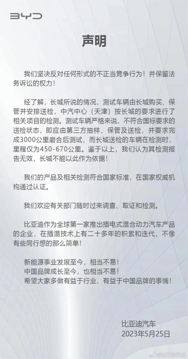 5月25日,长城汽车发布声明,公开举报比亚迪相关车型涉嫌整车蒸发污染物排放不达标。