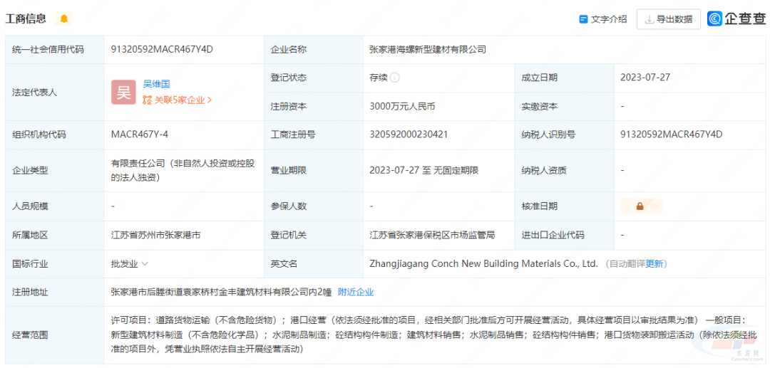 7月27日,张家港海螺新型建材有限公司成立,法定代表人为吴维国,注册资本3000万元,经营范围包含:水泥制品制造;砼结构构件制造;建筑材料销售等。企查查股权穿透显示,该公司由海螺水泥100%控股。