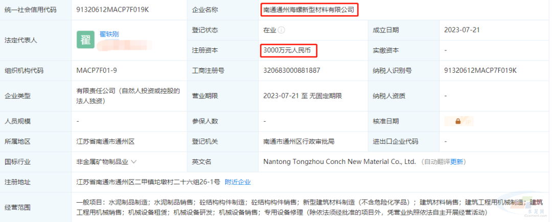 据查阅,南通通州海螺新型材料成立于2023年7月21日,法定代表人为翟轶刚,注册资本3000万元人民币,经营范围包含水泥制品制造;新型建筑材料制造(不含危险化学品);机械设备研发等。企查查股权穿透显示,该公司由海螺水泥100%控股。