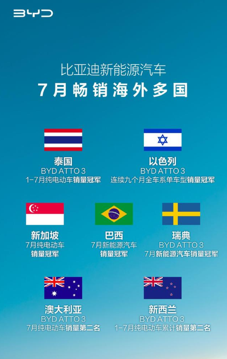 近日,比亚迪品牌及公关处副总经理杜国忠在社交平台表示,比亚迪新能源汽车7月畅销海外多国。