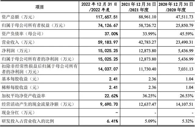 2020年、2021年和2022年,佳力奇的收入分别为2.35亿元、4.28亿元和5.92亿元,净利润分别为5436.99万元、1.29亿元和1.50亿元,扣非后净利润分别为7031.13万元、1.17亿元和1.40亿元。