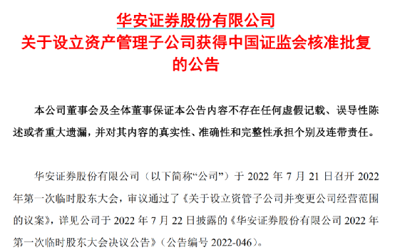证监会网站信息也显示,今年9月1日,证监会发布《关于核准华安证券股份有限公司设立资产管理子公司的批复》,中国证监会表示,华安证券应当按照法律、法规和有关规定的要求,完成华安资管组建工作,足额缴付出资,选举董事、监事,聘任高级管理人员。