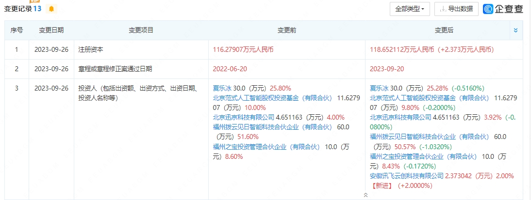 企查查app显示,近日,拨云见日(深圳)智能科技有限公司发生工商变更,股东新增科大讯飞旗下安徽讯飞云创科技有限公司,同时公司注册资本由约116.28万人民币增至约118.65万人民币。