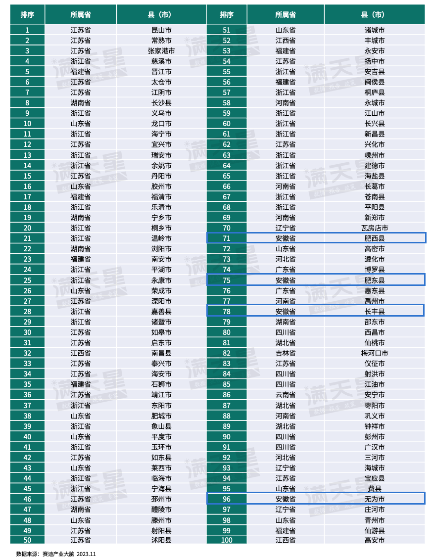 11月7日,赛迪顾问县域经济研究中心正式发布《2023中国县域投资竞争力百强研究报告》,研究遵循全面性、客观性、科学性评价原则,从政务服务能力、投资活力、要素吸引能力、基础设施支撑和生态环境五个维度构建赛迪县域投资竞争力评价体系,对全国(不包括香港特别行政区、澳门特别行政区、台湾地区)除市辖区、特区和林区以外的1864个县级行政区划单位(包含394个县级市、1301个县、117个自治县、49个旗、3个自治旗)投资竞争力进行全面评估,形成“赛迪县域投资竞争力百强(2023)”榜单。其中,安徽4地上榜。