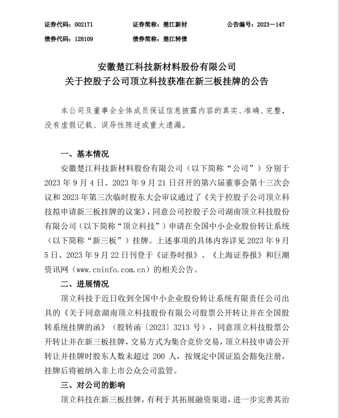 楚江新材12月4日晚间公告,公司控股子公司顶立科技获准在新三板挂牌。截至公告日,公司持有顶立科技66.7189%的股权,顶立科技在新三板挂牌后,仍是公司合并报表范围内控股子公司,不会影响公司对其的控制权。