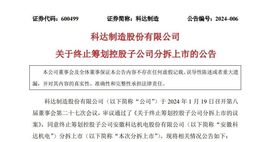 科达制造宣布终止拆分控股子公司安徽科达机电股份有限公司(简称安徽科达机电)上市进程。1月19日,科达制造公告披露,公司董事会审议通过了《关于终止筹划控股子公司分拆上市的议案》,同意终止筹划安徽科达机电分拆上市。