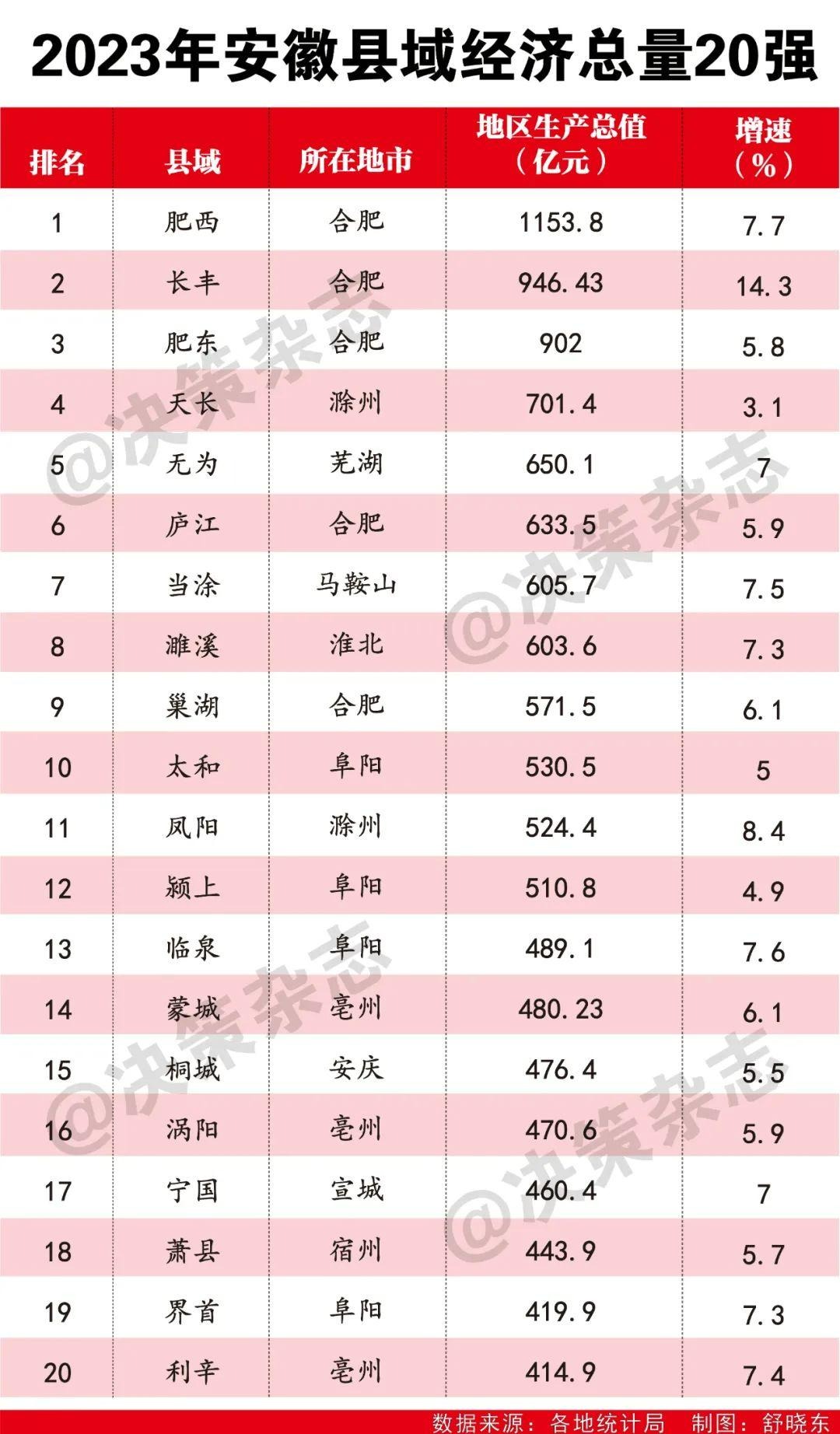 随着安徽各县(市)发布2023年经济运行数据,安徽县域经济总量20强榜单出炉。