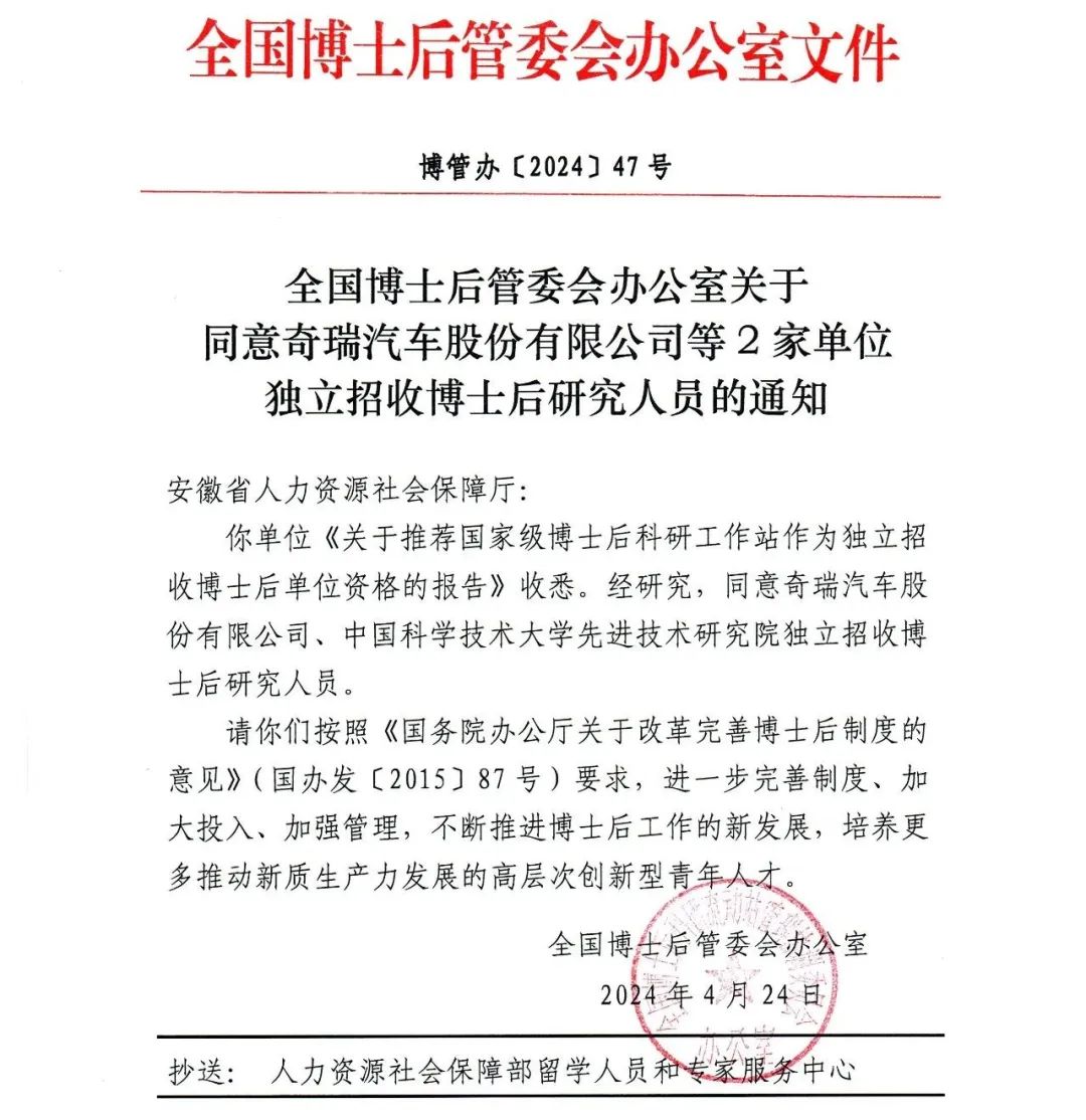 奇瑞汽车股份有限公司博士后科研工作站近日正式获得全国博士后管委会办公室批准,成为安徽省企业中,首家取得独立招收博士后研究人员资格的博士后工作站。