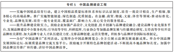 ——品牌建设取得更大进展。品牌培育、发展、壮大的促进机制和支持制度更加健全,品牌建设水平显著提高,企业争创品牌、大众信赖品牌的社会氛围更加浓厚,品质卓越、特色鲜明的品牌领军企业持续涌现,形成一大批质量过硬、优势明显的中国品牌。