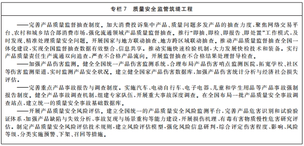 (二十七)优化质量监管效能。健全以“双随机、一公开”监管和“互联网 监管”为基本手段、以重点监管为补充、以信用监管为基础的新型监管机制。创新质量监管方式,完善市场准入制度,深化工业产品生产许可证和强制性认证制度改革,分类放宽一般工业产品和服务业准入限制,强化事前事中事后全链条监管。对涉及人民群众身体健康和生命财产安全、公共安全、生态环境安全的产品以及重点服务领域,依法实施严格监管。完善产品质量监督抽查制度,加强工业品和消费品质量监督检查,推动实现生产流通、线上线下一体化抽查,探索建立全国联动抽查机制,对重点产品实施全国企业抽查全覆盖,强化监督抽查结果处理。建立健全产品质量安全风险监控机制,完善产品伤害监测体系,开展质量安全风险识别、评估和处置。建立健全产品质量安全事故强制报告制度,开展重大质量安全事故调查与处理。健全产品召回管理体制机制,加强召回技术支撑,强化缺陷产品召回管理。构建重点产品质量安全追溯体系,完善质量安全追溯标准,加强数据开放共享,形成来源可查、去向可追、责任可究的质量安全追溯链条。加强产品防伪监督管理。建立质量安全“沙盒监管”制度,为新产品新业态发展提供容错纠错空间。加强市场秩序综合治理,营造公平竞争的市场环境,促进质量竞争、优胜劣汰。严格进出口商品质量安全检验监管,持续完善进出口商品质量安全风险预警和快速反应监管机制。加大对城乡结合部、农村等重点区域假冒伪劣的打击力度。强化网络平台销售商品质量监管,健全跨地区跨行业监管协调联动机制,推进线上线下一体化监管。