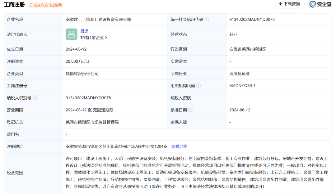 日前,安徽建工(镜湖)建设投资有限公司成立,法定代表人为吕远,注册资本2亿元,经营范围包含:工程管理服务;金属结构制造;金属结构销售;建筑用金属配件制造等。