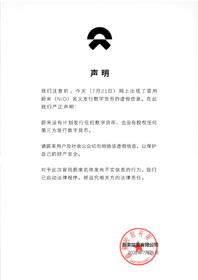 7月21日,蔚来发布声明称,今天网上出现了冒用蔚来名义发行数字货币的虚假信息。