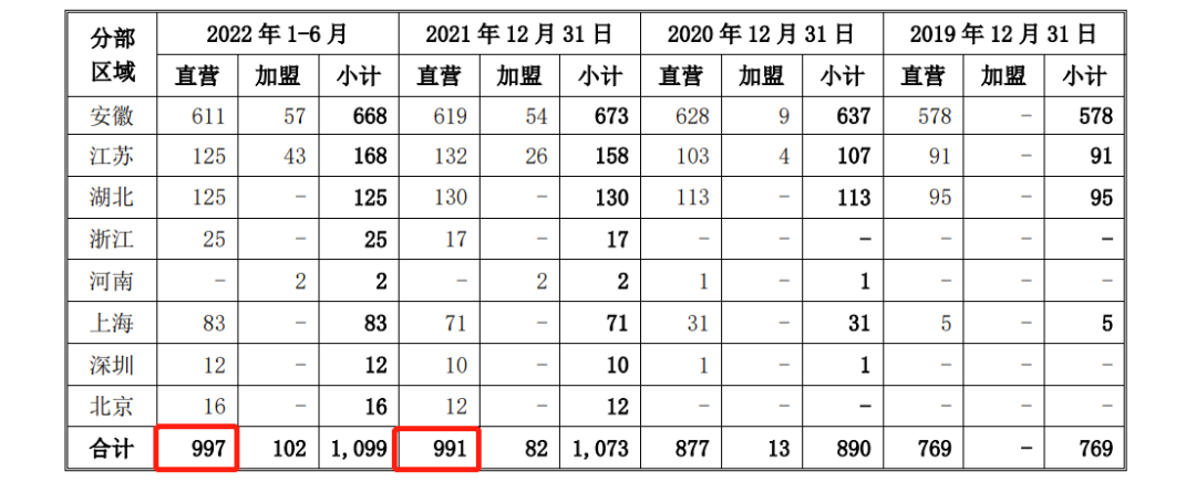 招股书显示,成立于2003年的老乡鸡从安徽起步,从2017年开始逐步向安徽市场以外的区域扩展,现已进入上海、湖北、江苏、浙江、北京以及深圳等地。截至2022年6月30日,老乡鸡拥有997家直营门店和102家加盟门店。老乡鸡5月份披露的招股书显示,截至2021年12月31日,老乡鸡全国范围内拥有991家直营门店和82家加盟门店。