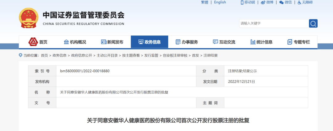 近日,据证监会凯发pa旗舰下载官网消息,证监会同意安徽华人健康医药股份有限公司首次公开发行股票并在创业板上市的注册申请。