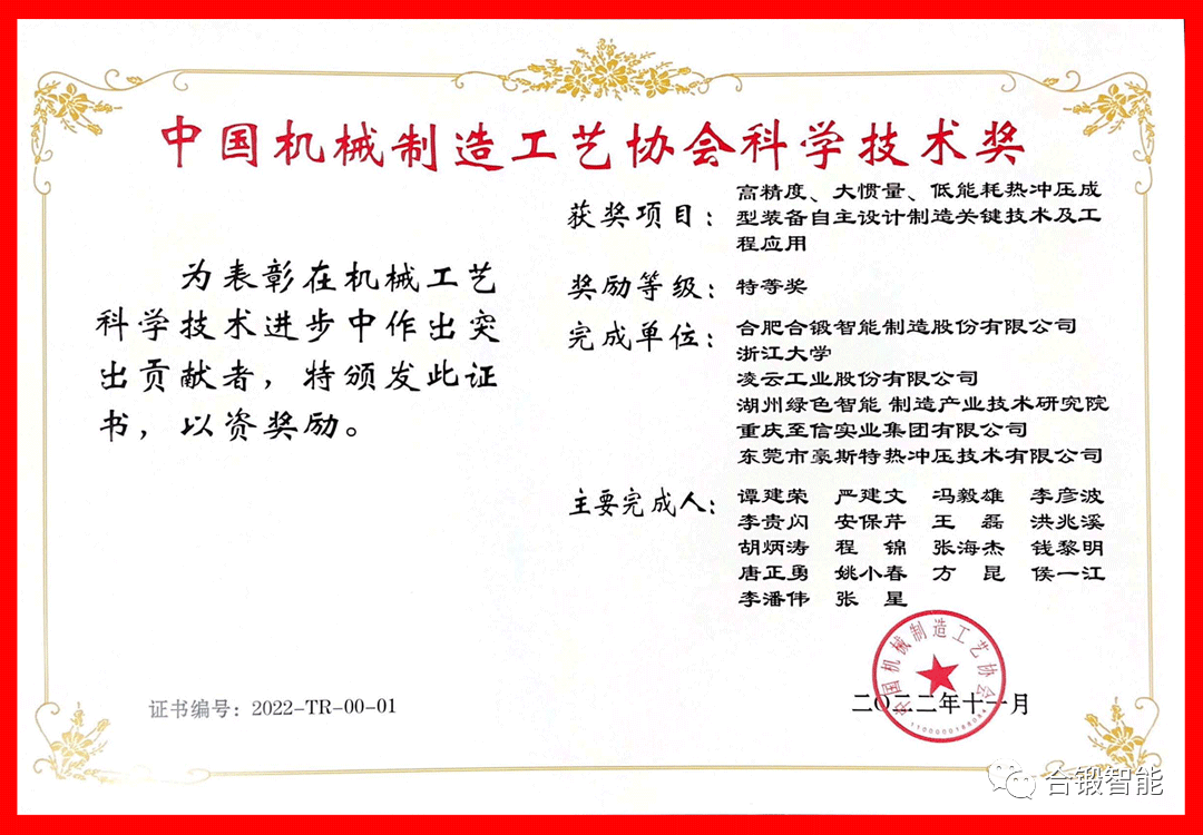 近日,中国机械制造工艺协会组织的2022年度“中国机械制造工艺协会科学技术奖”评审结束,合锻智能与浙江大学、凌云工业等单位联合申报的“高精度、大惯量、低能耗热冲压成型装备自主设计制造关键技术及工程应用”项目获年度唯一一项特等奖。