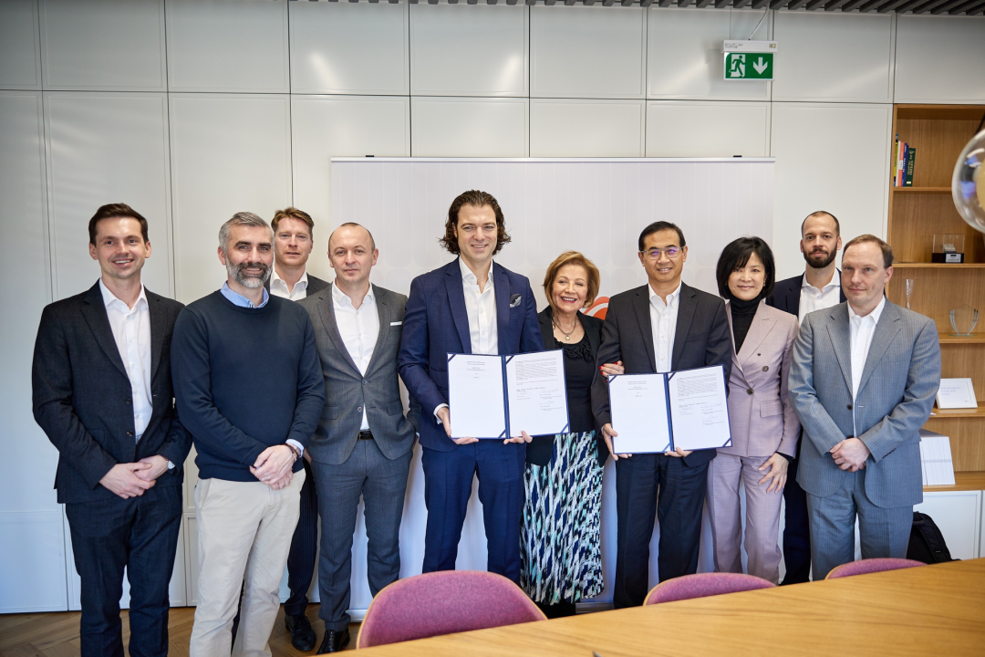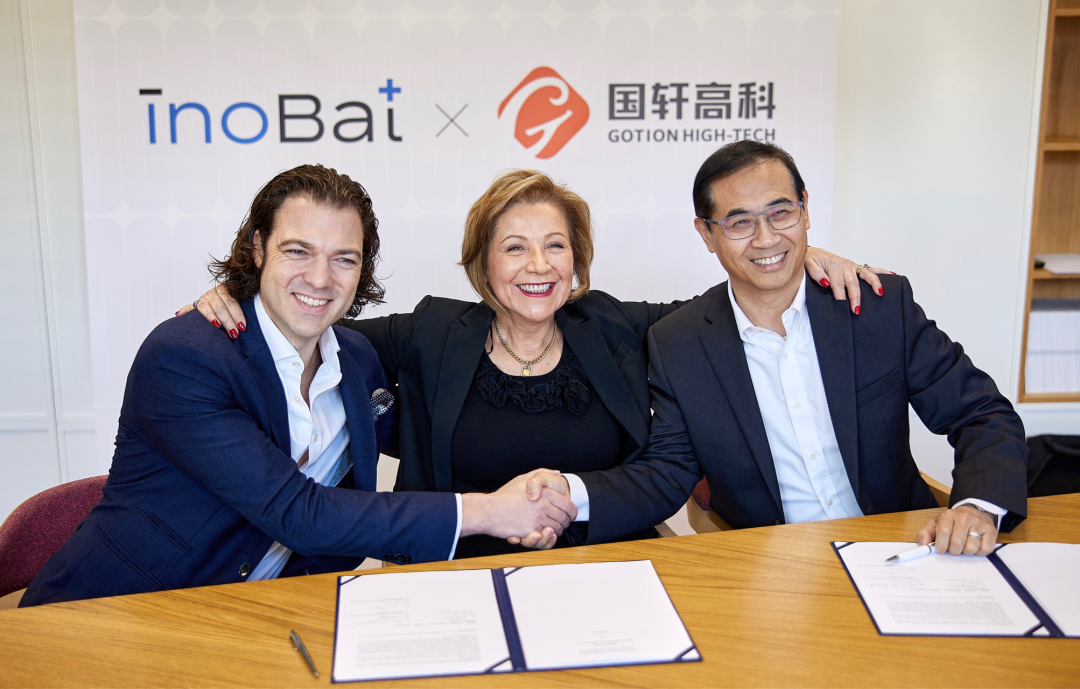 inobat公司创始人兼首席执行官marian bocek(左)与国轩高科工研总院院长、高级副总裁蔡毅(右)代表双方签约,inobat 董事会成员兼首席发展官 tara lindstedt (中)见证