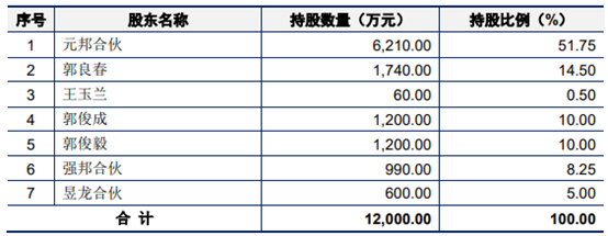 郭良春、王玉兰夫妇通过持有元邦合伙100%出资份额间接持有公司51.75%的股份,郭良春和王玉兰夫妇及其子郭俊成和郭俊毅合计直接持有公司35%的股份。此外,郭俊成和郭俊毅通过员工持股平台强邦合伙和昱龙合伙分别间接持有公司2%和0.65%的股份,郭良春家族直接和间接合计持有公司89.4%的股份。