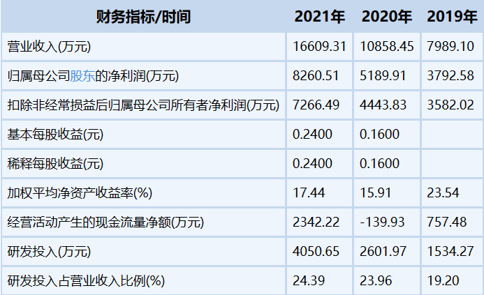 财务数据显示,2019年-2021年公司实现营业收入分别为7989.10万元、1.09亿元、1.66亿元,实现净利润分别为3792.58万元、5189.91万元、8260.51万元。增幅方面,2021年公司营业收入增长52.96%,净利润同比增长59.16%。