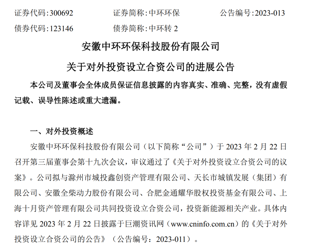 近日,上市公司中环环保发布公告,安徽中环环保科技股份有限公司于2023年2月22日召开第三届董事会第十九次会议,审议通过了《关于对外投资设立合资公司的议案》。公司拟与滁州市城投鑫创资产管理有限公司、天长市城镇发展(集团)有限公司、安徽全柴动力股份有限公司、合肥金通耀华股权投资基金有限公司、上海十月资产管理有限公司共同投资设立合资公司,投资新能源相关产业。